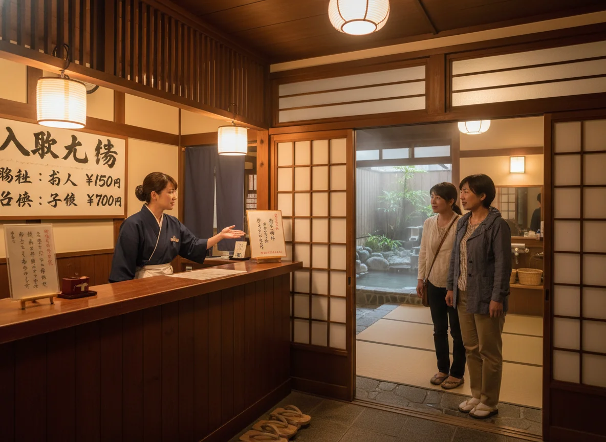 料金システムについて: 山田さんは「入浴料はいくらですか?」と尋ねると、スタッフは「大人は1,000円です」と教えてもらいました。山田さんは日本の料金システムの明確さに感心しました。
