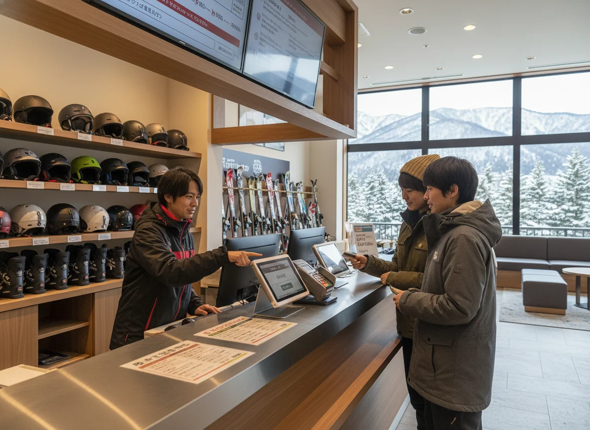 装備のレンタルについて: 山田さんは「スキーセットをレンタルしたいのですが」と伝えると、店員さんが「サイズは何センチですか?」と尋ねてくれました。山田さんは日本のサービスの細やかさに感心しました。