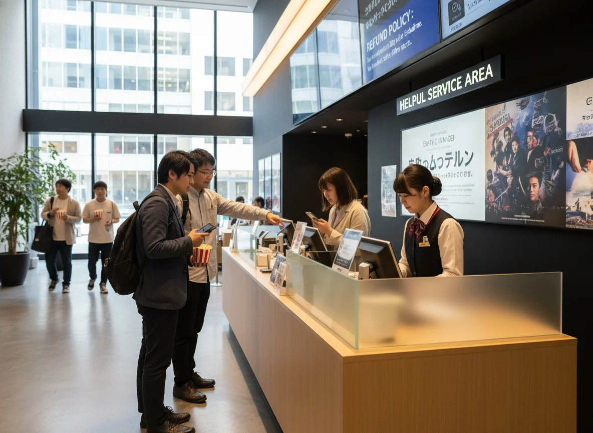 退票システム: 山田さんは「チケットの払い戻しは可能ですか?」と尋ねると、「上映開始30分前まで可能です。手数料として200円がかかります」と教えてもらいました。山田さんは日本の映画館の柔軟なシステムに感心しました。
