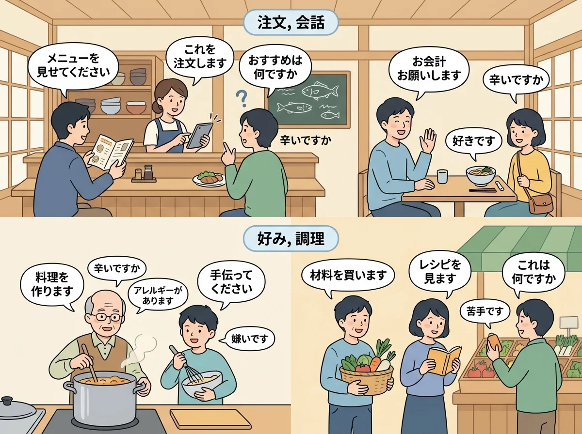 一邊學食物相關的詞,一邊注意它們出現的時機,你會發現:日本人的飲食文化,其實是用很多小句子慢慢堆出來的。