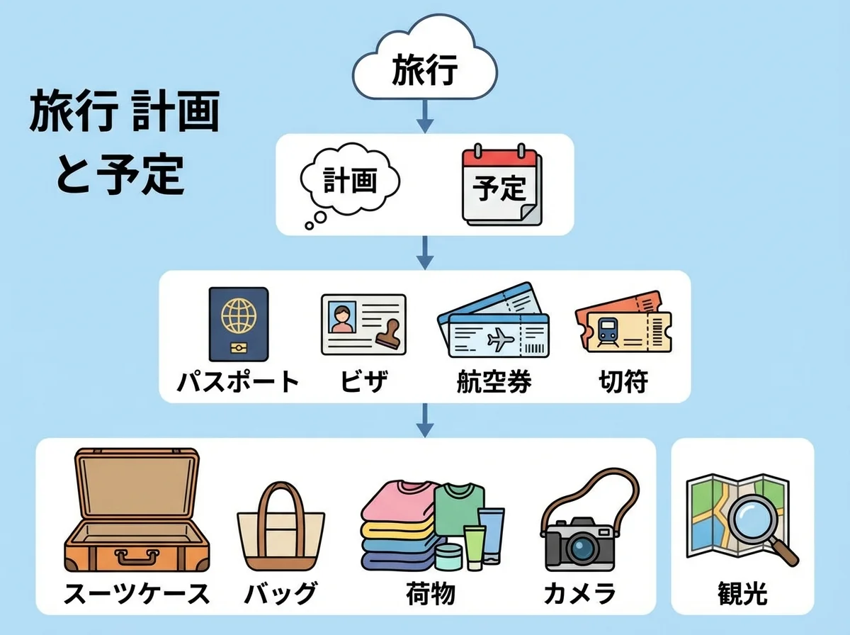 例句:旅行を計画します。(ryokou wo keikaku shimasu) - 我計劃旅行。